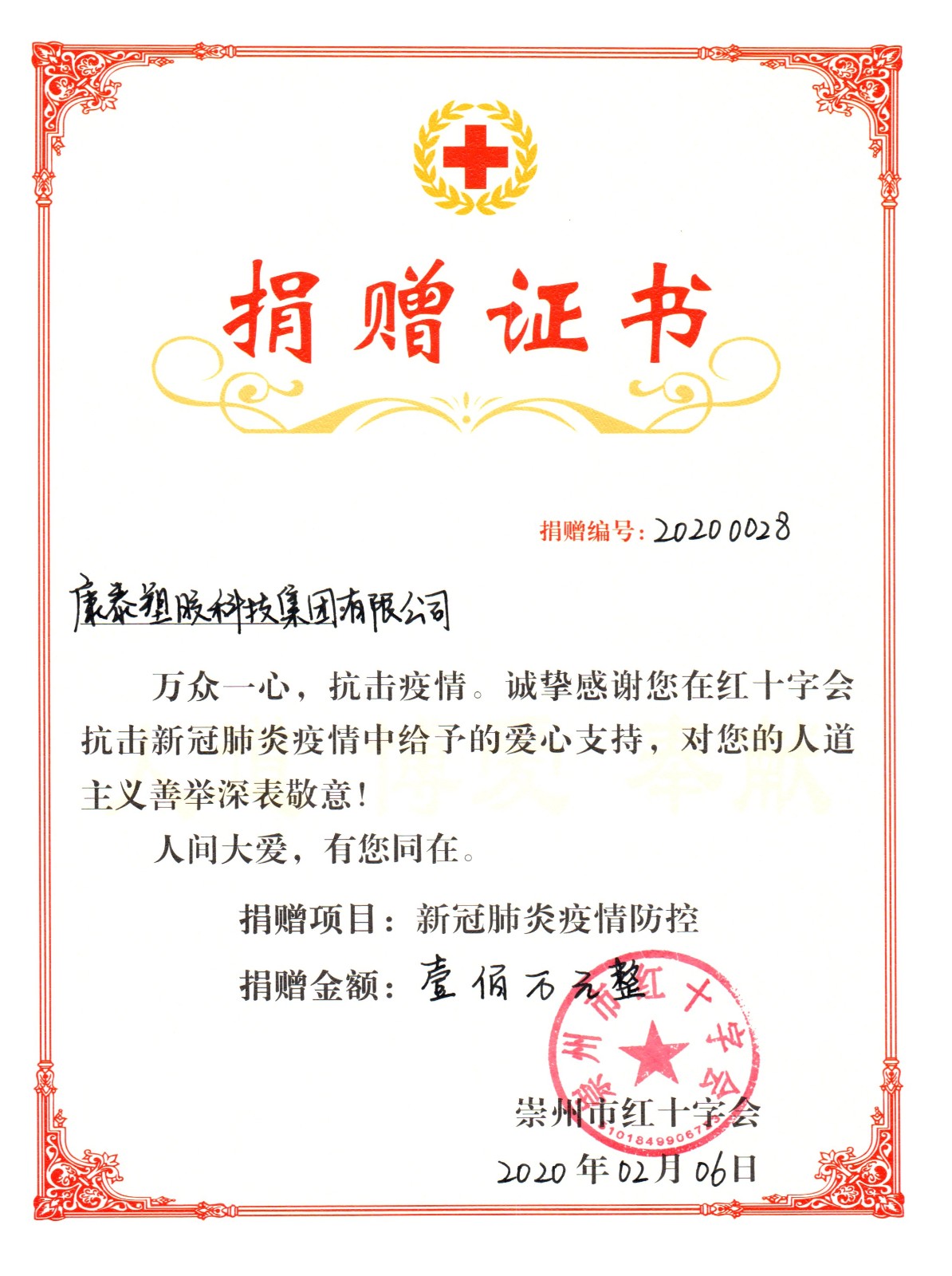 2022.03康泰集團(tuán)捐款100萬元助力崇州市疫情防控阻擊戰(zhàn)2020年1月,正當(dāng)全國(guó)人民喜迎新春佳節(jié)時(shí),一場(chǎng)突然而來的新型冠狀病毒肺炎疫情肆虐中華大地。面對(duì)新型冠狀病毒全民戰(zhàn)爭(zhēng),直接關(guān)系國(guó)家民族、企業(yè)興衰、自身安危,康泰塑膠科技集團(tuán)有限公司作為一家有使命、有擔(dān)當(dāng)?shù)慕ú钠髽I(yè),集團(tuán)董事長(zhǎng)林云青...閱讀人數(shù):9004 -