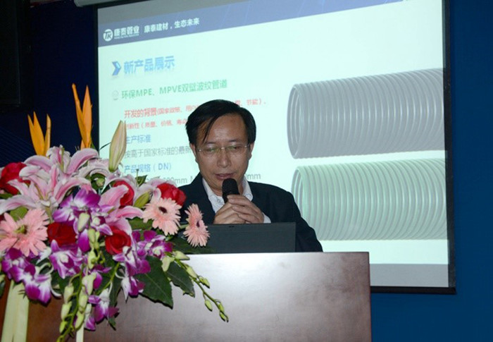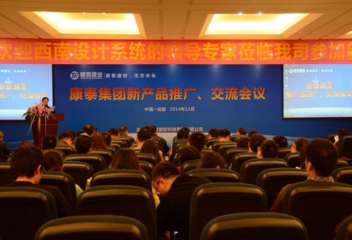 ?????? 11月27日,“康泰集團(tuán)2014年度新產(chǎn)品成都推廣、交流會”在集團(tuán)總部圓滿落下帷幕。本次新品推廣、交流會以生態(tài)環(huán)保為主題,以市場需求、國家政策和先進(jìn)技術(shù)為導(dǎo)向,共推出了環(huán)保MPE、MPVE?雙壁波紋管道、PP超靜音排水管道、HDPE同層排水管道、加強(qiáng)型漩流降噪特殊單立管道五種新品,獲得了參會人員的一直好評。會上,大家共同學(xué)習(xí)了解了康泰集團(tuán)的最新產(chǎn)品,會議達(dá)到了預(yù)期效果,取得了圓滿成功。?????? 此次會議是康泰集團(tuán)繼重慶之后在成都舉辦的西南設(shè)計(jì)系統(tǒng)的新產(chǎn)品推廣、交流專場盛會。中國市政工程西南設(shè)計(jì)研究總院總工程師羅萬申等近百位西南設(shè)計(jì)系統(tǒng)的領(lǐng)導(dǎo)、專家撥冗蒞臨,集團(tuán)公司董事長兼總裁林云青、營銷中心總監(jiān)何朝暉、技術(shù)研發(fā)中心總監(jiān)張雙全、營銷中心副總監(jiān)王金濤,以及相關(guān)部門領(lǐng)導(dǎo)和人員參加了本次會議。